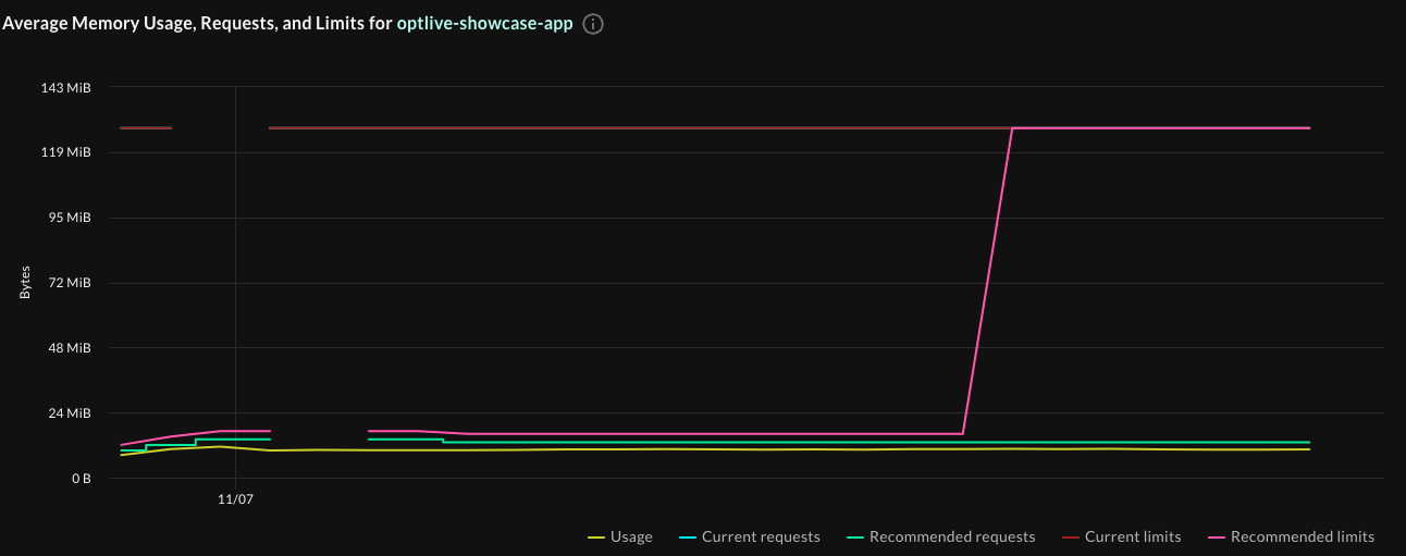 And if you look at the average usage graphs, for example, this graph of the optlive-showcase-app container shows the projected impact of using recommended settings, averaged across the time period shown on the graph.