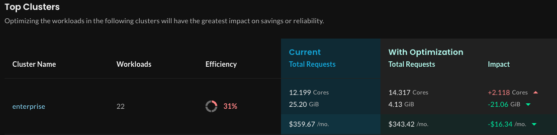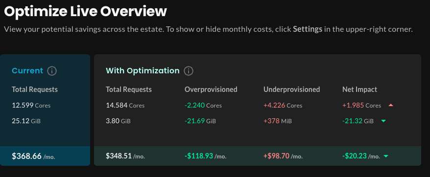 Let’s break down the numbers. At this point for this example—which reflects a tiny cluster—you’d realize a net savings of $20.23 a month by applying recommendations.