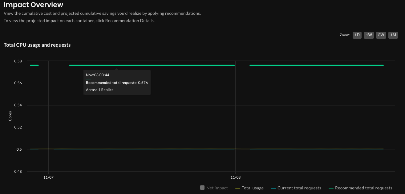 On the workload details page, click the Impact tab. The Impact Overview section shows time-series graphs of usage, current request settings, and the projected impact of applying recommendations on a workload, based on how that workload and its containers are configured (such as optimization goals, optimization policy, container-specific requests, and limits).
