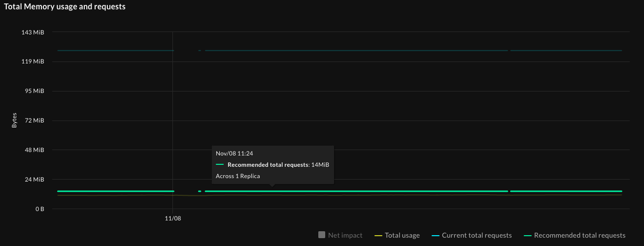 Same with total memory usage and requests: The current total requests line is much higher than the actual usage, so the recommended Total Requests value will help to rightsize this workload.