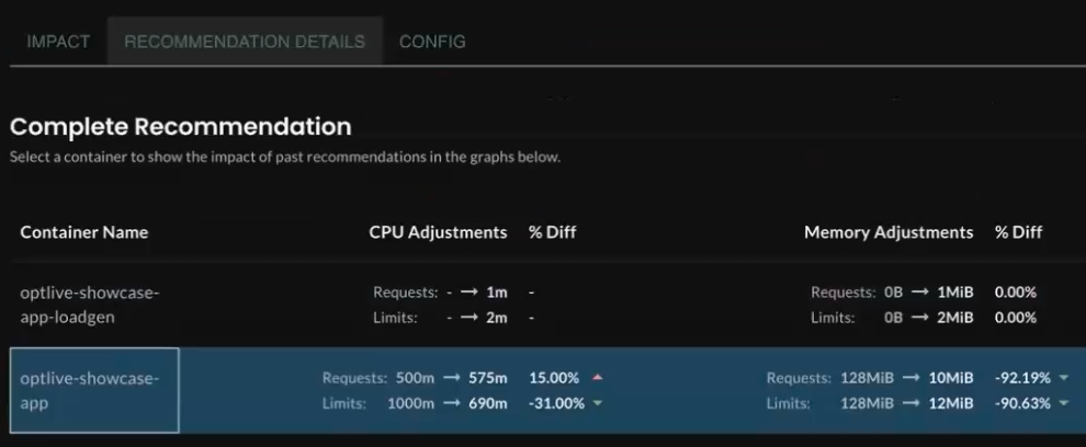 On the workload details page, click the Recommendation tab to see the recommended requests and limits for each container. The selected row shows the current and recommended settings for the optlive-showcase-app container (which, by coincidence, has the same name as the workload):