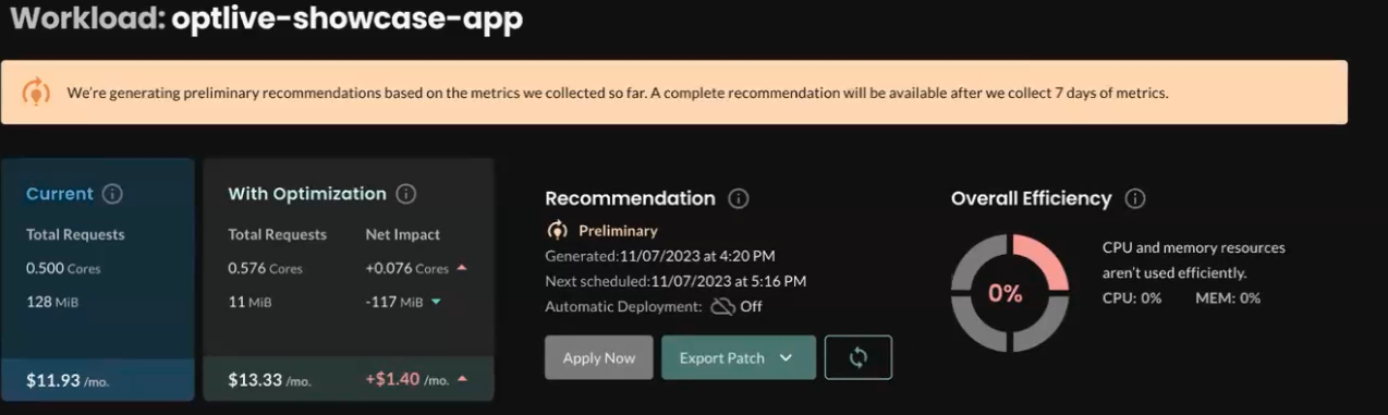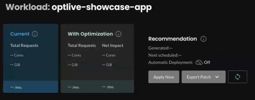 About 10 minutes after installing the Agent, you’ll get a preliminary recommendation for rightsizing the Showcase application (the optlive-showcase-app workload). You can view the recommendation on the workload details page: In the left navigation, click Workloads and then find and click optlive-showcase-app. You’ll see something like this: