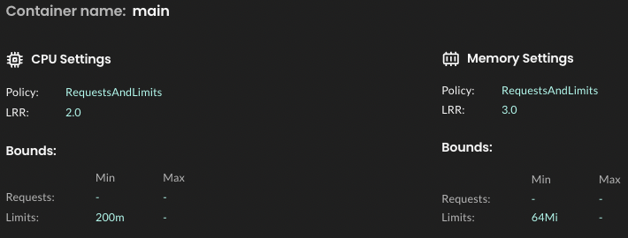In this example, if recommendations were to be applied, they would adjust both the requests and limits values for the container.