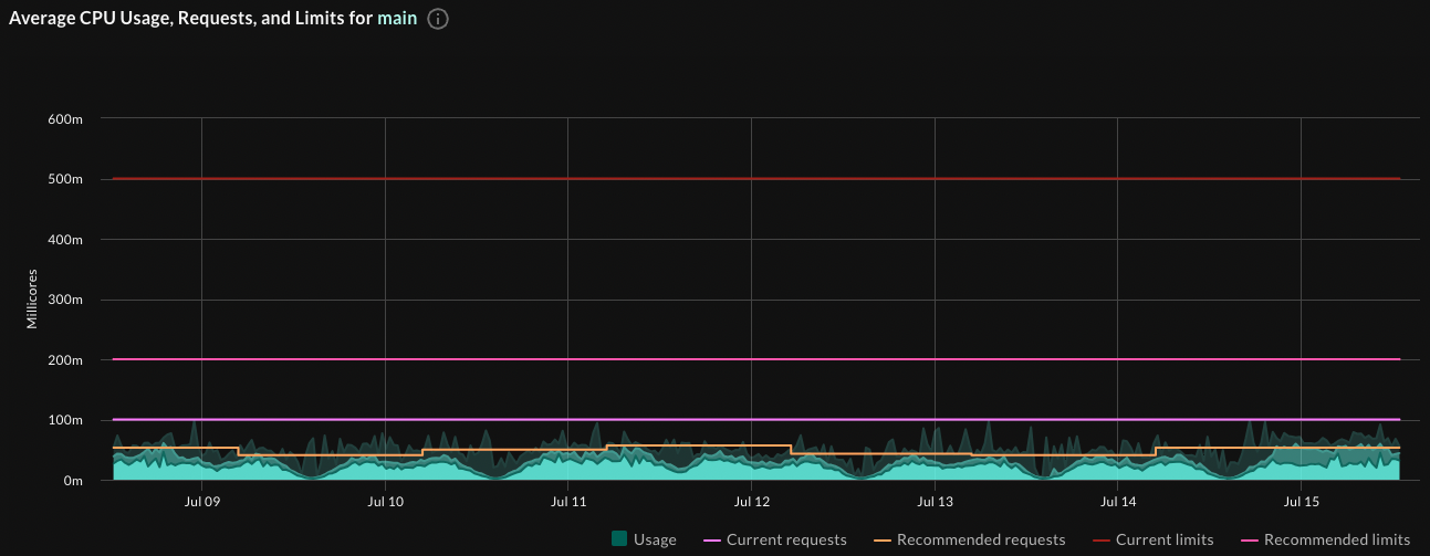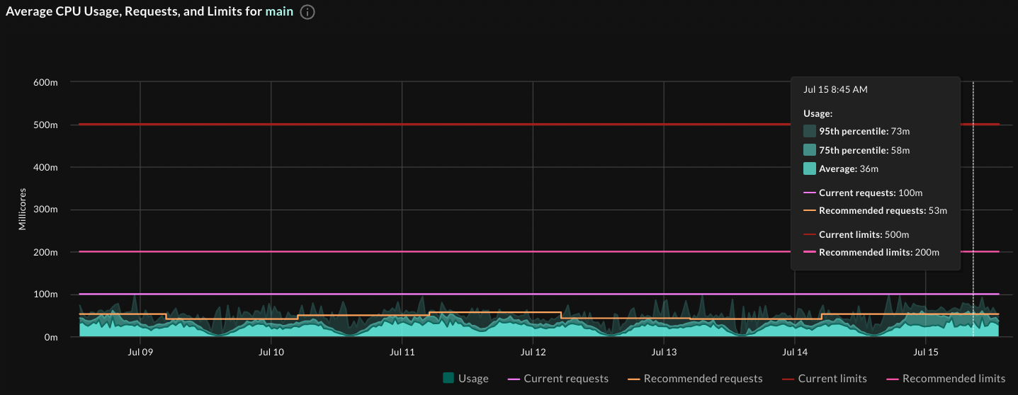 Going back to the Average CPU usage graph (because it’s more dynamic than the memory graph), when you hover over a point during which this recommendation was valid, you see that the recommended settings in the graph match the most recent recommendation settings - look at the recommended requests: