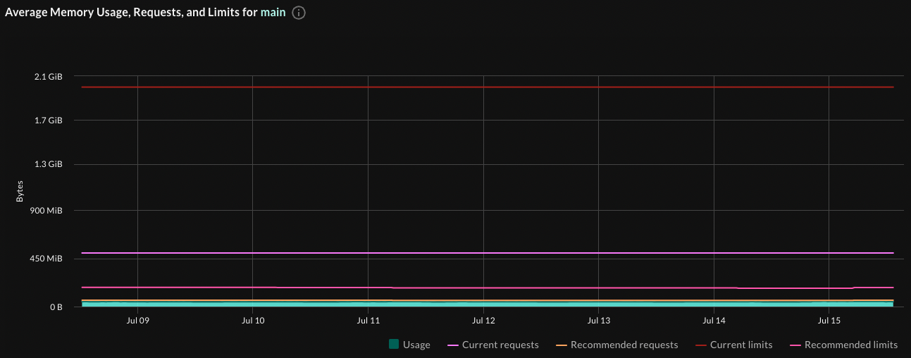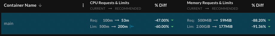 Go to the Recommendation tab, which shows the current and proposed requests and limits values for each container. Optimize Live recommends the following adjustments: