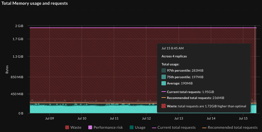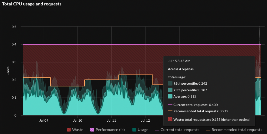 Notice the how much higher the current total requests (the purple line) are compared to the actual usage (the bright green shaded section) and the recommended total requests (the orange line). The red section shows wasted resources. This workload is overprovisioned with respect to CPU resources, and applying recommendations would rightsize it.