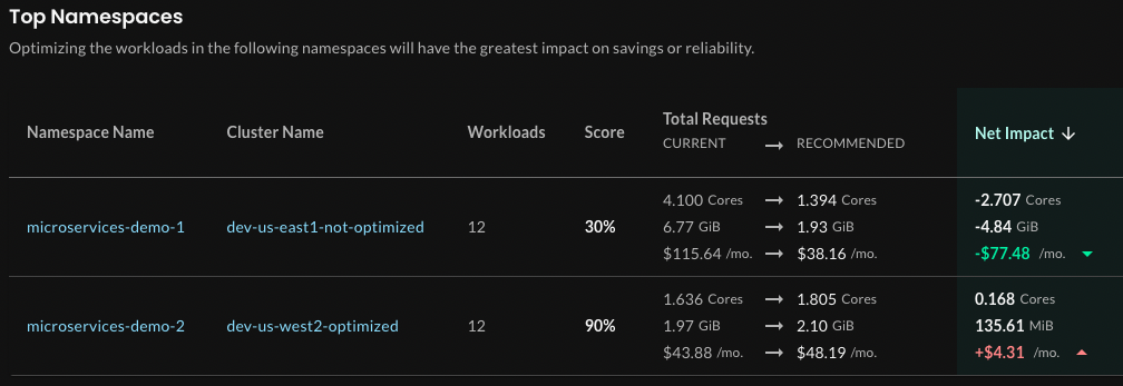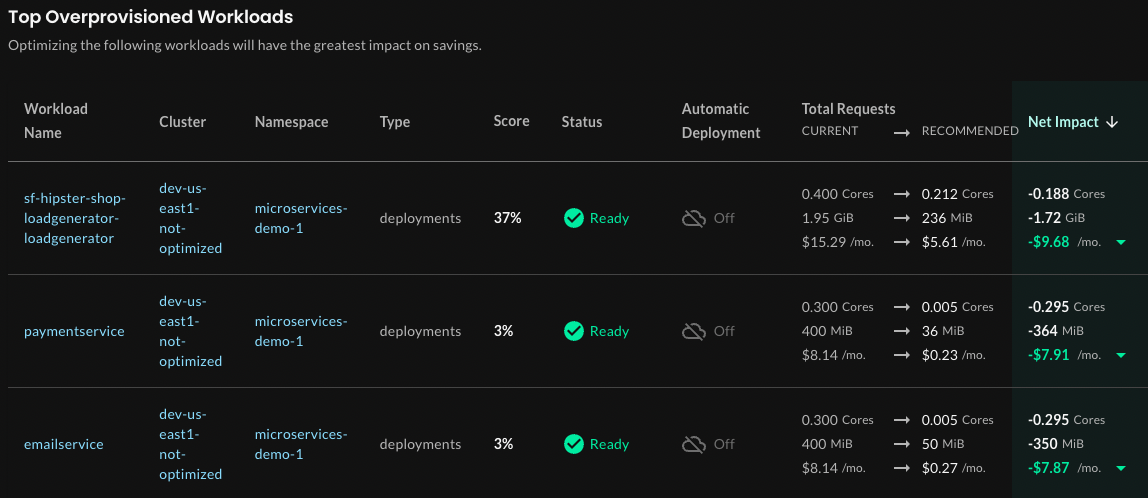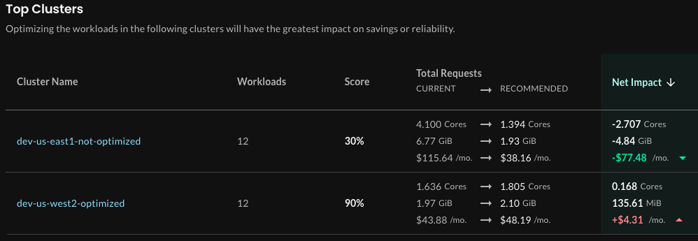 Notice how the dev-us-east1-not-optimized cluster is listed first: Its overall optimization score is much lower (30%), and the difference between current total requests and optimized total requests is greater than the dev-us-west2-optimized cluster. Optimizing the workloads in this cluster will have the greatest impact on savings.