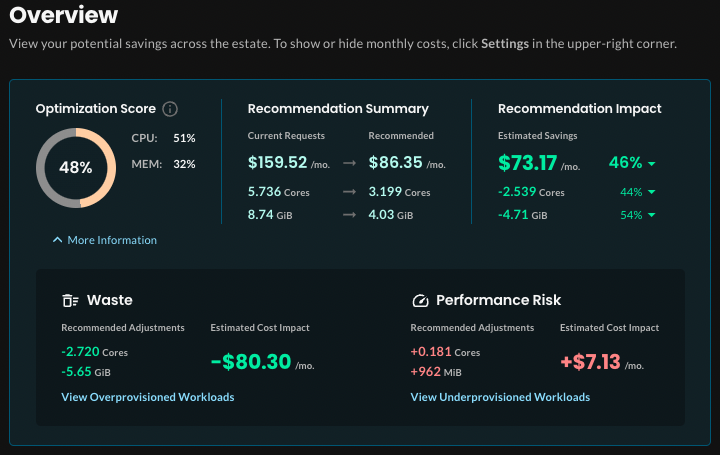 - Rightsizing overprovisioned workloads will potentially save you 5.65 GiB, thus reducing costs.